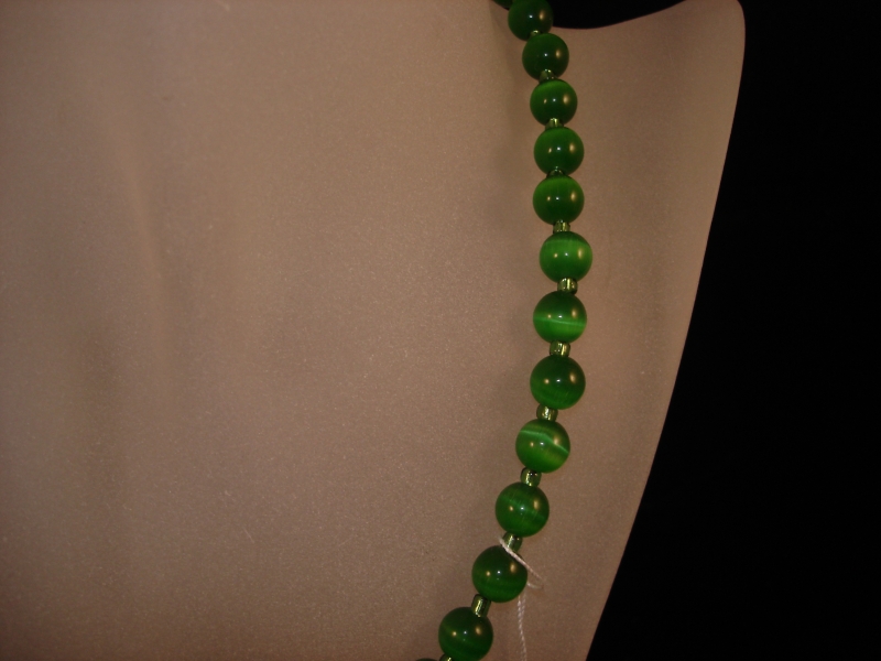 Sehr schöne Kette aus grünem Katzenauge . Die Edelsteinkette ist auf Edelstahlseide aufgezogen und wird mit einem Karabinerverschluss aus Edelstahl verschlossen. Sie ist ca. 42cm lang und die Perlen haben einen Durchmesser von ca. 8mm. Die Perlen sind abwechselnd mit grünen Roccailles gefädelt.